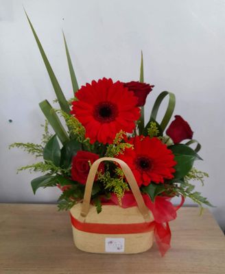 A sweet selection of red roses, gerberas, gypsophila and foliage arranged within a cute basket finished with a red ribbon. A simple yet classic way to say "I love you"